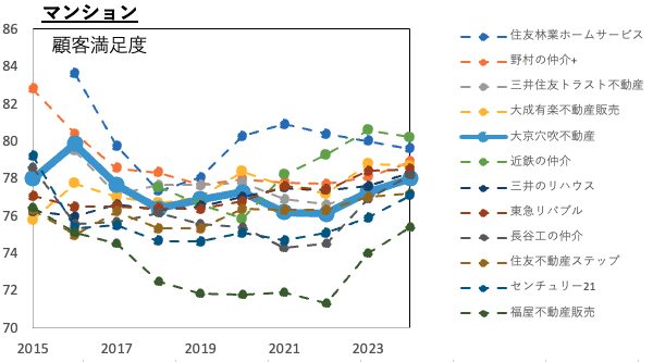 大京穴吹不動産の顧客満足度は2016年に急上昇して、その後は一度下がって横ばいです。